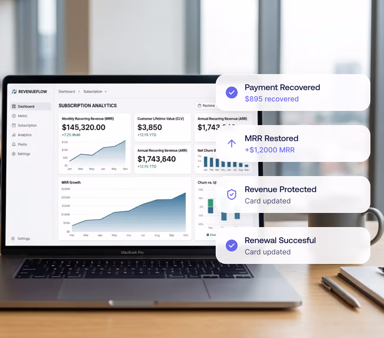 Every unrecovered payment lowers your monthly recurring revenue (MRR), impacts your customer lifetime value (CLV) and increases churn your product team can’t fix. We recover the revenue classified as lost by your billing provider, turning payment failures into success renewal that belongs to your business.